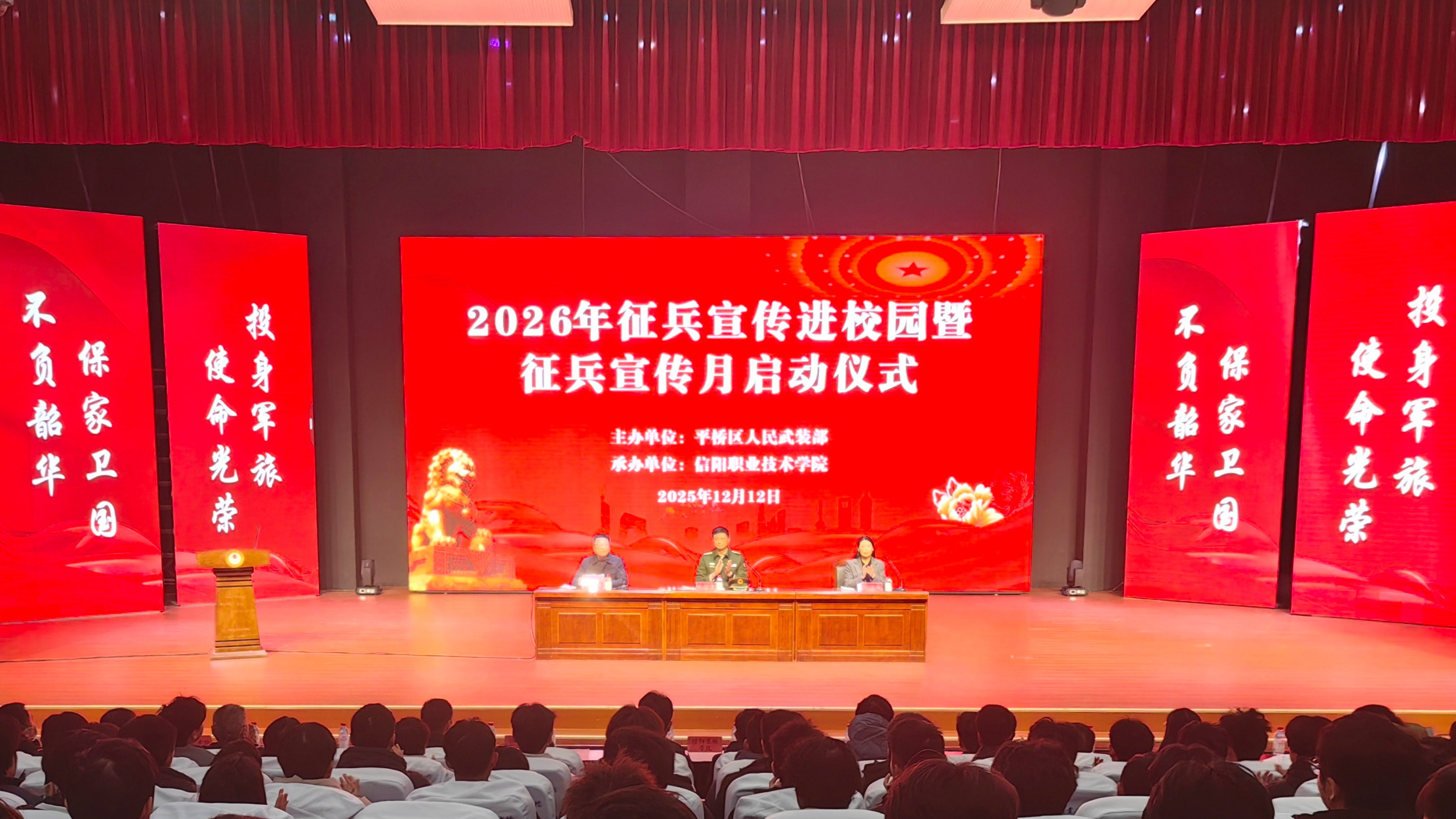 为扎实做好2026年征兵工作,发挥高校主阵地作用,厚植青年学生家国情怀,12月12日下午,我校在图书馆报告厅举行2026年征兵宣传进校园暨征兵宣传月启动仪式。平桥区人民武装部领导甄旭东,驻平桥各高校武装部部长,学校党委委员、副校长严正香,武装部全体人员,各学院负责征兵工作的副书记(副院长)、征兵专干,学生代表共计750余人参会。仪式由武装部部长代翔主持。
